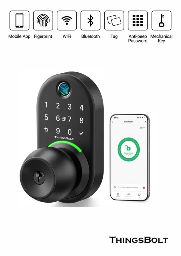 • Manage Access with APP: Authorize unlock permissions for your family or friends with the ThingsBolt APP. Generate one-time passcords for your temporary visitors when you out. Check the unlock record in the APP to know who and when unlocked your door. You can manage more than 1000 locks with just one APP.
